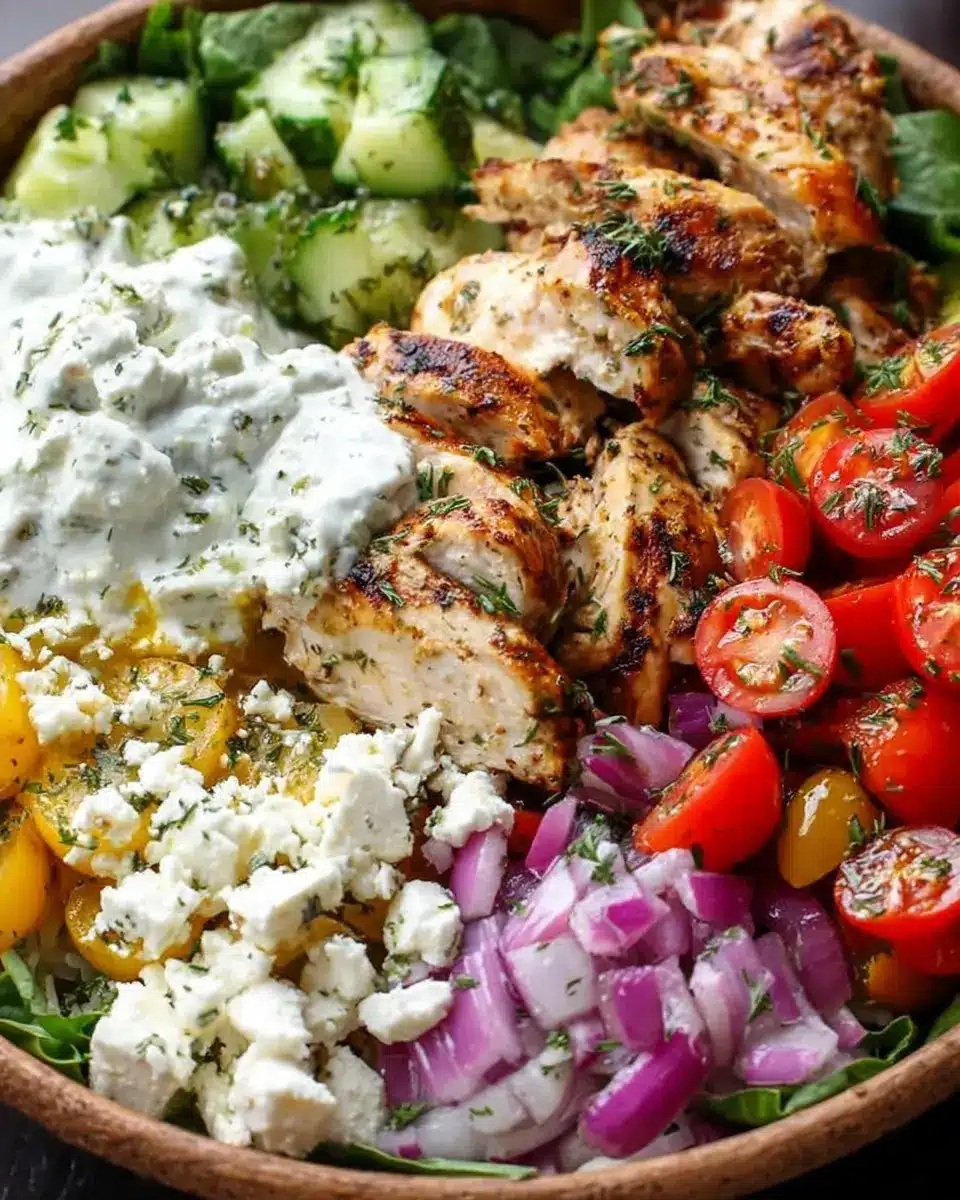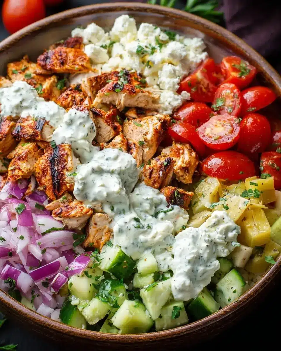 Now comes the fun part: assembling your Chicken Gyro Bowls! Start with a base of 2 cups of cooked brown rice. Top it with your succulent chicken, then add 1 cup of quartered cherry tomatoes, 1 cup of diced cucumber, ¼ cup of diced red onion, and ⅓ cup of kalamata olives. Don’t forget to sprinkle ½ cup of crumbled feta on top and drizzle generously with your tzatziki sauce.
