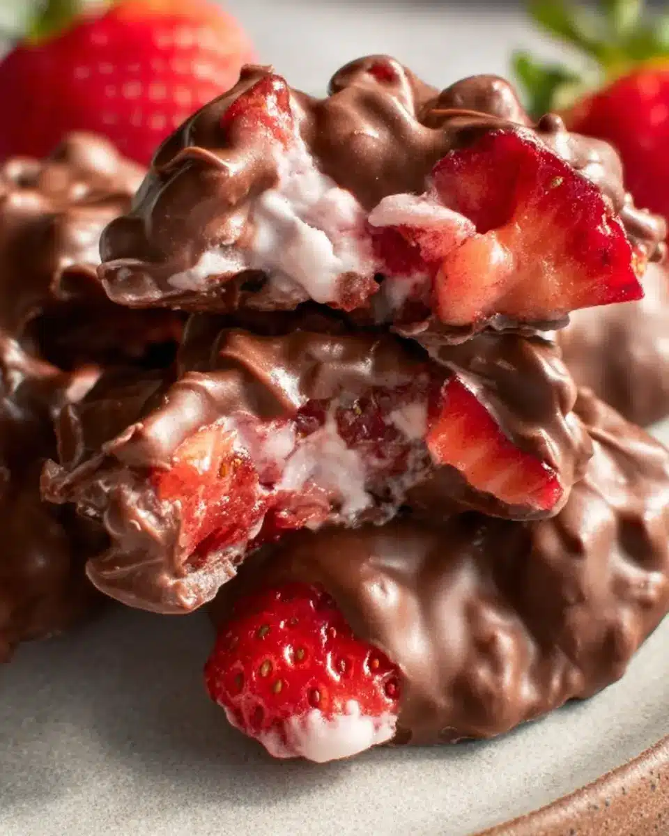 To get your chocolate strawberry yogurt clusters just right, opt for thicker Greek yogurt to lend structure. Ensure your strawberries are well-drained before mixing to avoid excess moisture. This keeps your clusters firm and delicious! Spread the mixture into even dollops on your parchment-lined baking sheet, then pop it into the freezer long enough for those flavors to meld and firm up, typically about 1-2 hours.