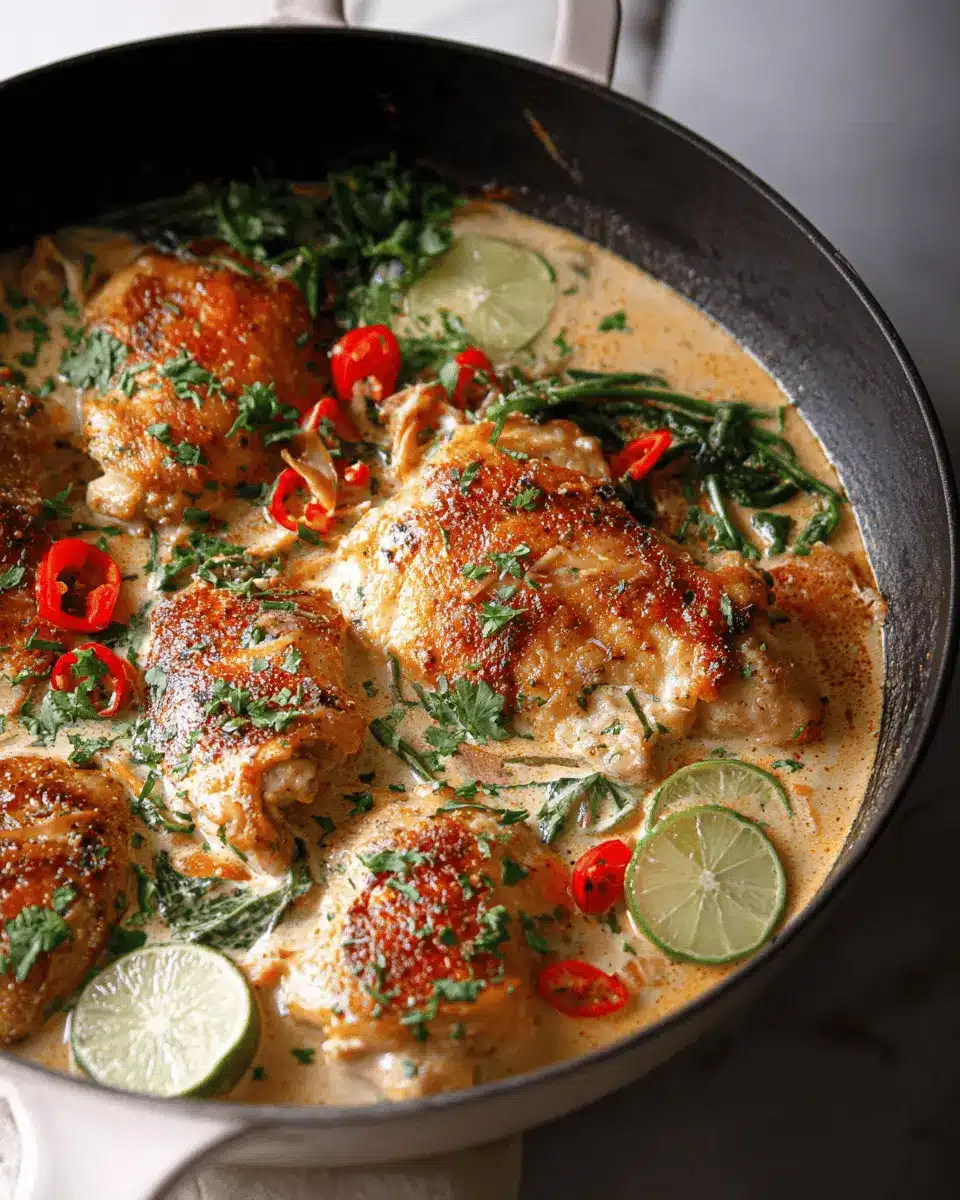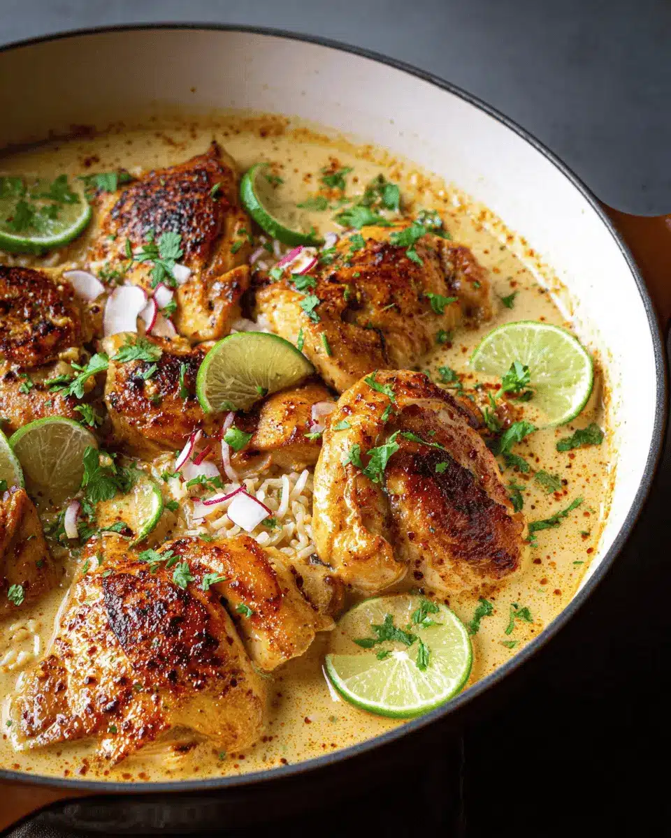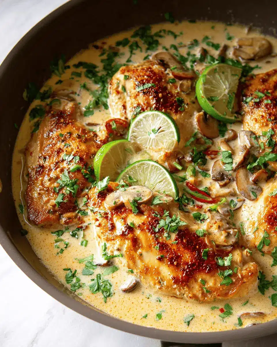 Imagine sinking your fork into tender chicken breasts simmered in rich coconut cream, complemented by zesty lime juice and a hint of spice. It’s a delightful blend of tropical tastes that transports you to a sunny getaway with every mouthful.