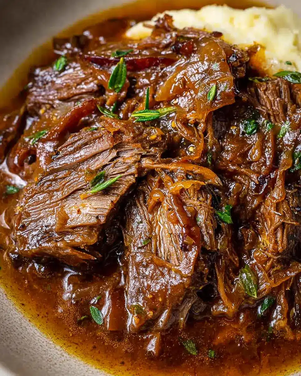 Once it's done, skim any excess fat from the surface if you wish, and don’t forget to remove the thyme stems before serving! Shred the roast into bite-sized pieces and enjoy your delightful French Onion Pot Roast with some fresh thyme leaves for garnish.