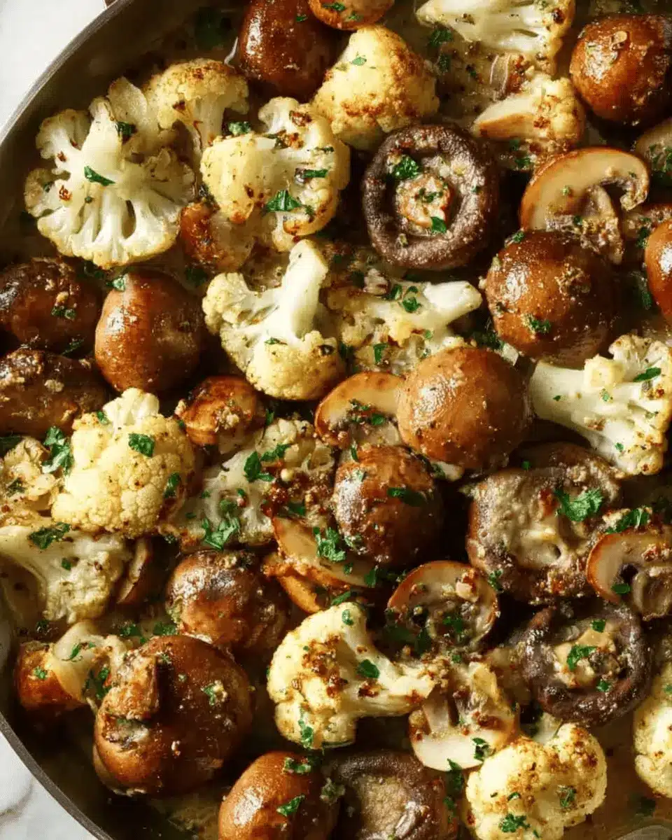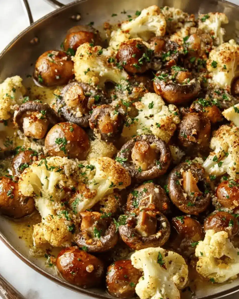 Absolutely! To create a vegan version of these Garlic Butter Mushrooms and Cauliflower, simply replace the butter with a plant-based alternative, like vegan butter or olive oil. You can also swap the chicken stock for vegetable broth for a fully vegan dish. It will still be hearty and flavorful, perfect for any gathering!