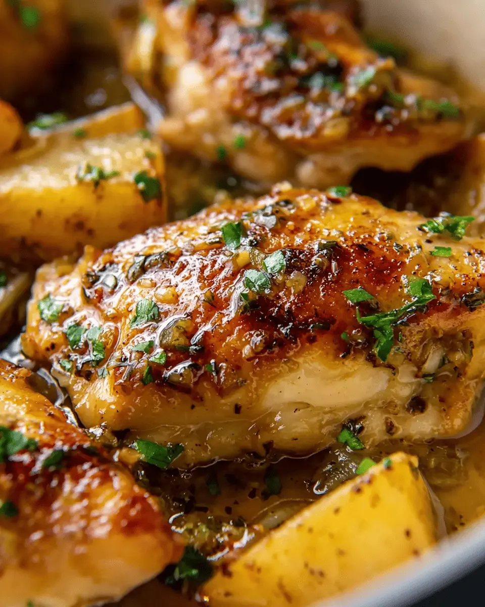 - Serve: Serve the chicken thighs with the potatoes and remaining juices spooned over the top. Garnish with fresh parsley, if using.