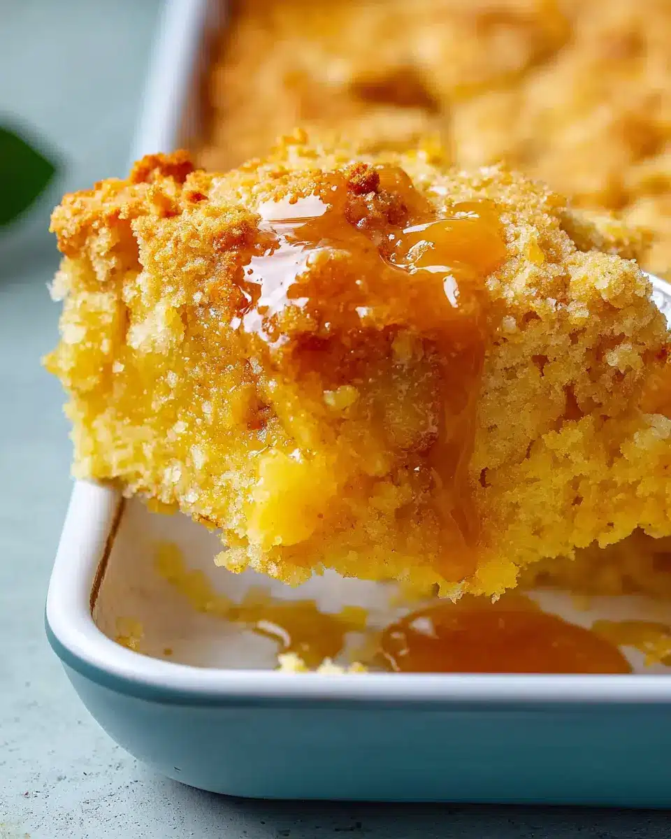 Once your peaches are nestled in the baking dish, it’s time to layer the cake mix. Simply sprinkle the entire package of yellow cake mix evenly over the peaches. This layer acts as the cobbler’s topping, so don’t be shy—make sure you cover all the fruit! It might seem like a lot of mix, but trust the process. Each bite will be worth it!