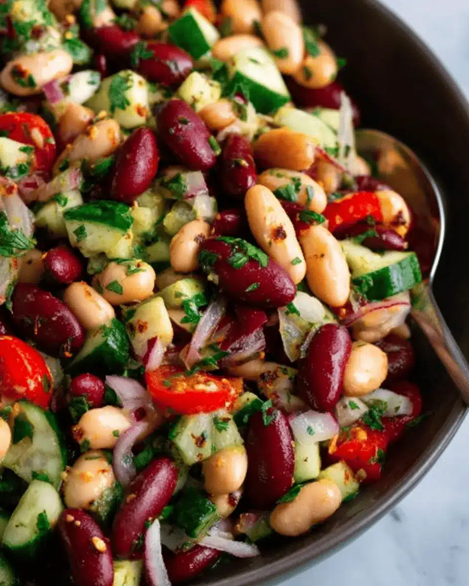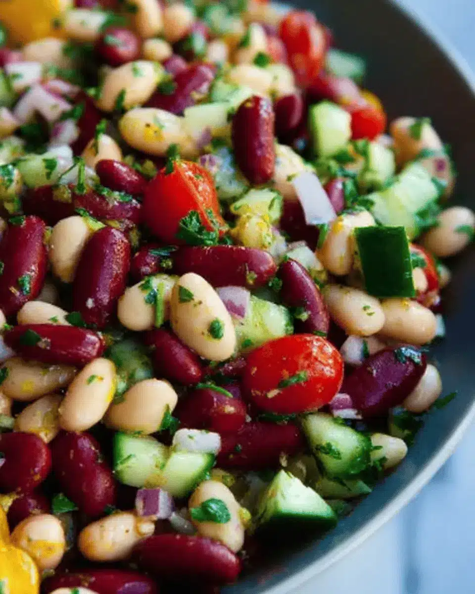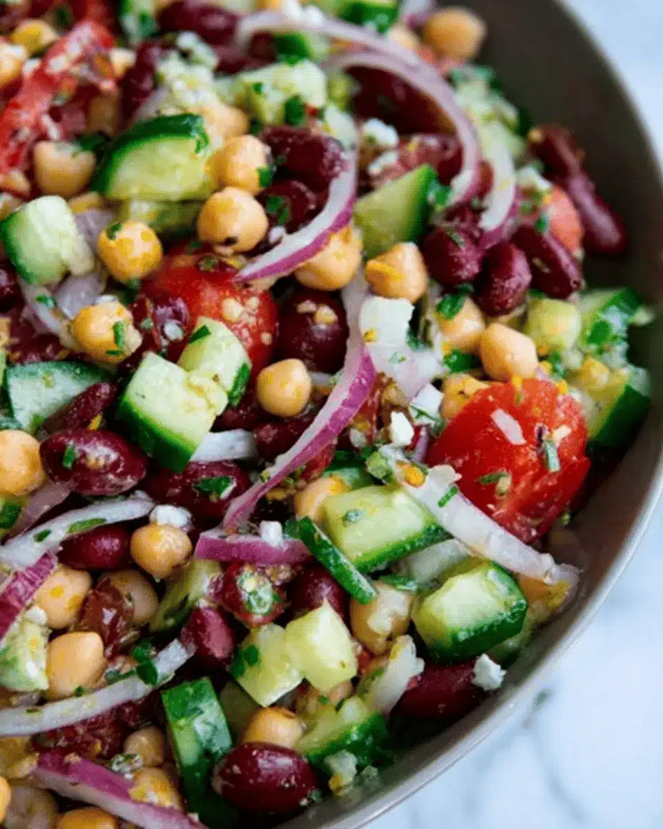 You have a choice here! You can serve your Mediterranean Bean Salad right away for the freshest taste, or, if you prefer, let it marinate in the refrigerator for a couple of hours. This waiting time allows the flavors to meld together beautifully. If you have leftovers, don’t worry! They can last up to four days refrigerated, just give them a little wake-up call with a sprinkle of salt or a drizzle of lemon juice!
