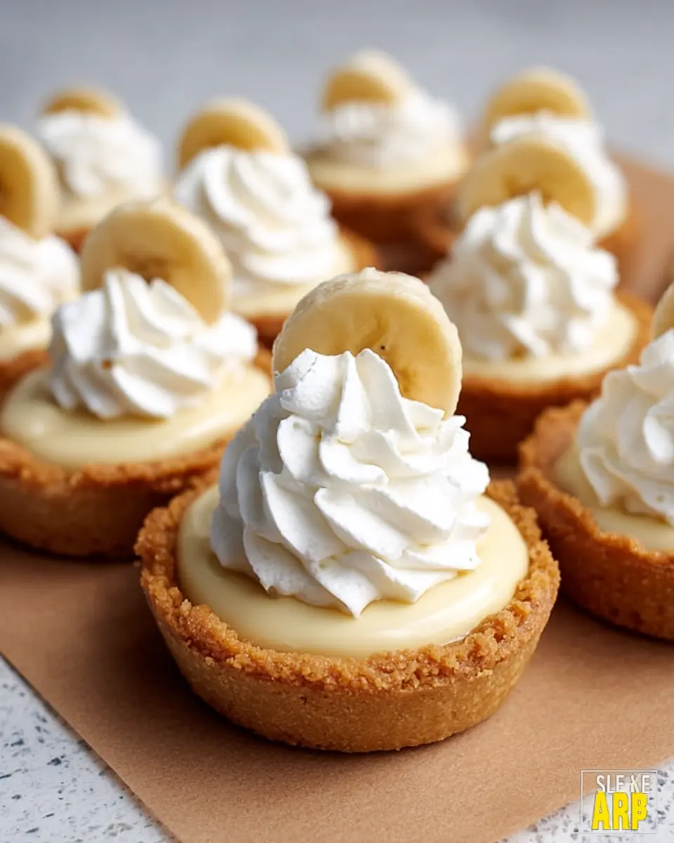 Serve your mini banana cream pie on a vibrant platter to showcase their charm. Adding a dollop of whipped cream on top, garnished with a slice of fresh banana and a sprinkle of crushed vanilla wafer, enhances their presentation. For a touch of elegance, use small dessert forks or spoons, and consider adding a few mint leaves for a pop of color. Personalize each mini pie with a little label made of decorative paper, perhaps writing the flavors or a sweet message for your guests to enjoy!