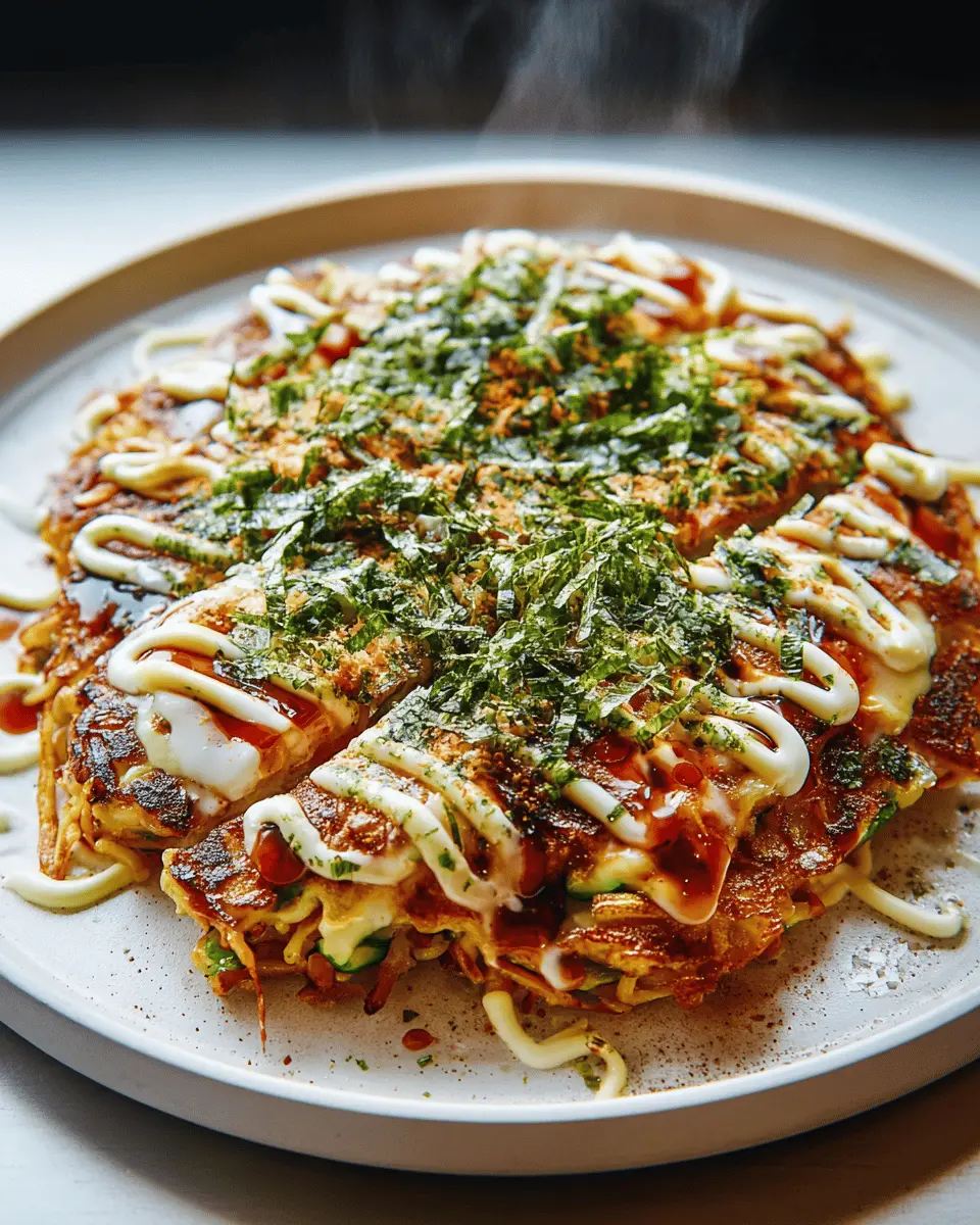 Make your okonomiyaki visually appealing by garnishing it with a sprinkle of katsuobushi and aonori. Consider slicing your pancake into wedges for easy sharing. Plating it on a colorful dish not only invites excitement but also enhances the dining experience. You can even create a small dipping station with additional sauces for variation, making the meal interactive and fun!