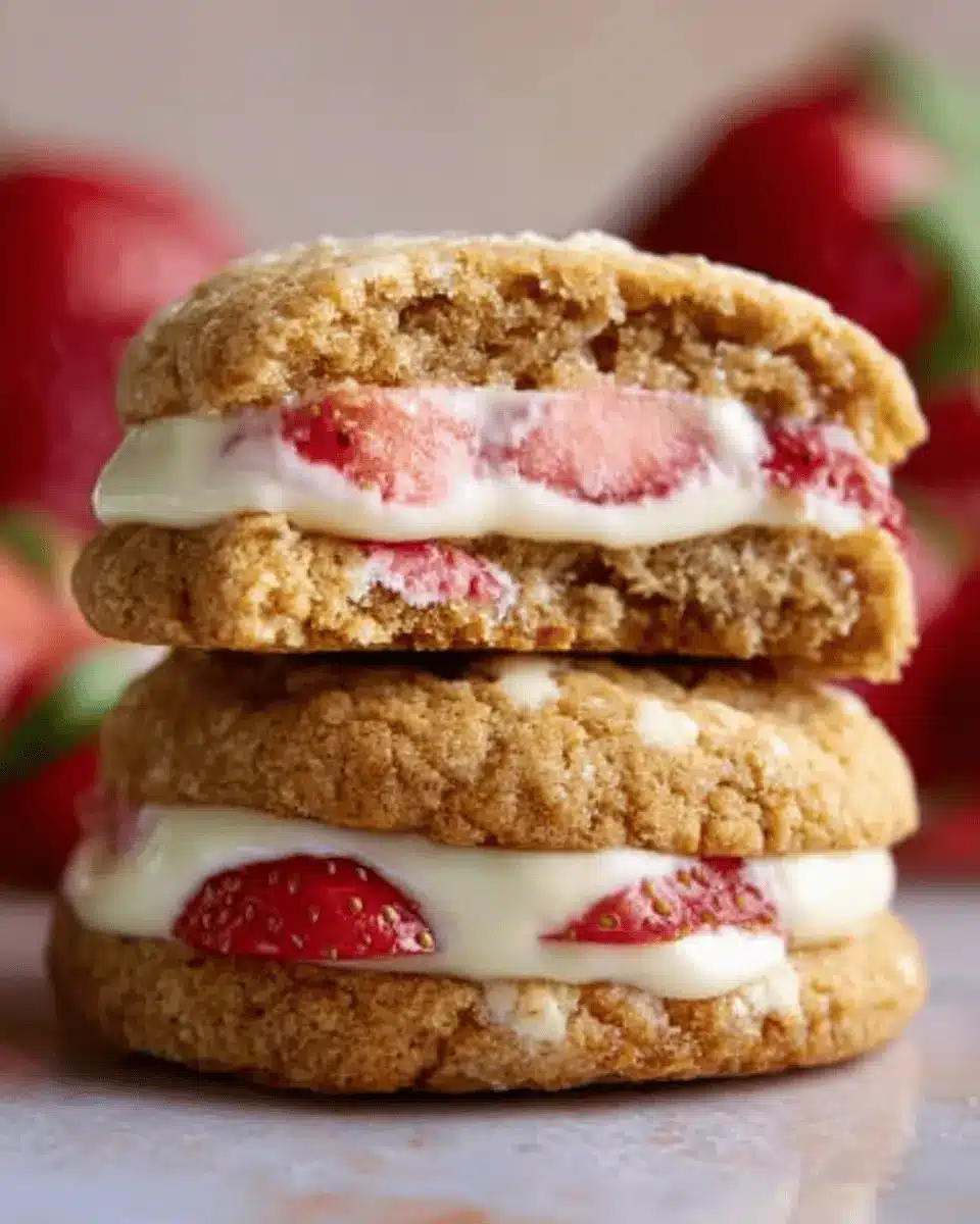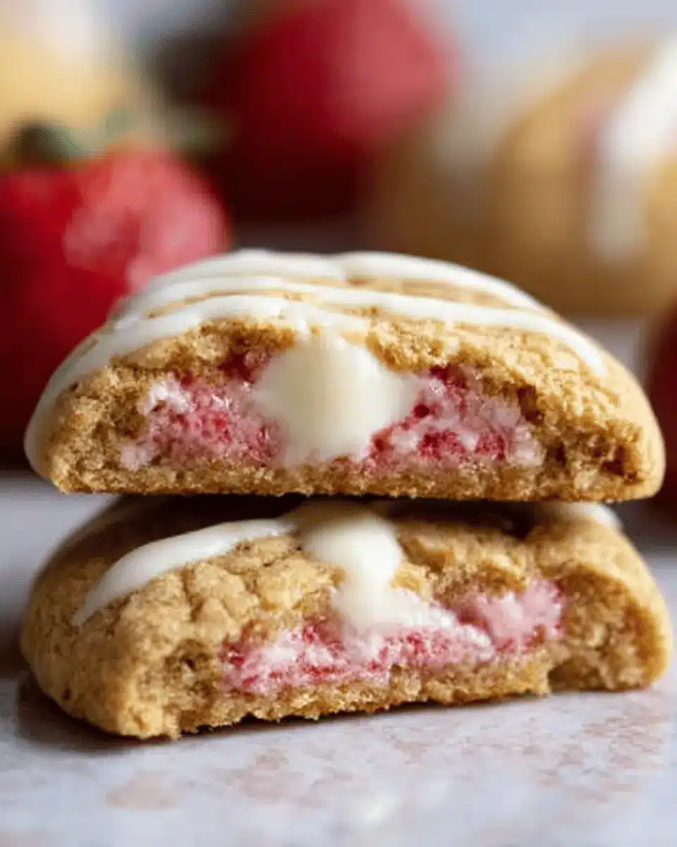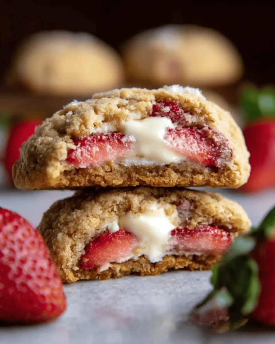 Looking for a dairy-free alternative? Try vegan strawberry cheesecake cookies! Substitute the cream cheese filling with cashew cream or a store-bought vegan cream cheese. Replace the butter with coconut oil or vegan butter and use a flax egg (1 tablespoon flaxseed meal mixed with 2.5 tablespoons of water) instead of regular eggs. These swaps maintain the flavor while catering to a plant-based diet.
